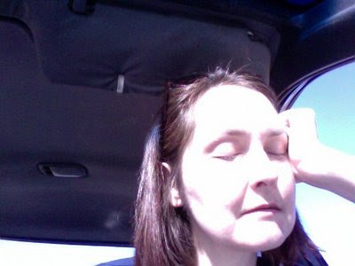 It was a gorgeous day. It wasn't possible to say no, even feeling so crummy, so we went. Rob drove out along the bumpy the airport road and parked me in the sun, then he and the dog went for a walk around the lake. Getting out the front door used up my little store of energy, so even though I wanted to go with them I stayed in the car with the windows rolled down and did this: